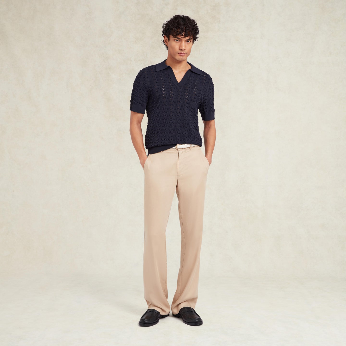 The Ripple Knit Polo returns in navy as a refined colour update to the Ripple Knit story. Cut in a relaxed fit, it features a structured knit with a distinctive ripple texture that adds depth without overwhelming the look. The open neck and clean collar give it an effortless, confident feel, while ribbed trims provide a considered finish. Textural, versatile, and quietly statement-making, it’s a piece designed to elevate everyday dressing.
