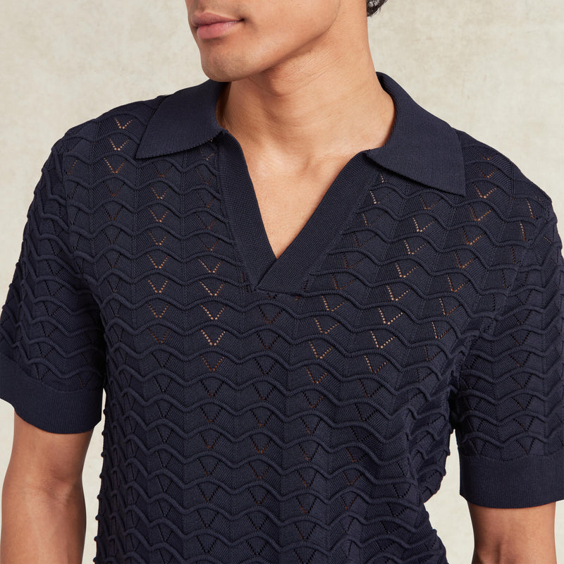 Ripple Knit Open Neck Polo - Navy
